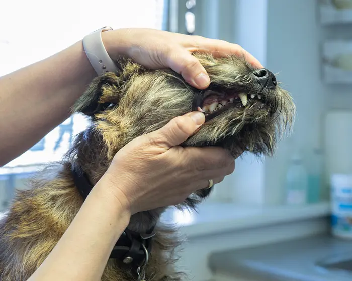 Det er vigtigt at hunden i forbindelse med det årlige sundhedseftersyn også får undersøgt sine tænder. Hvis der ved denne undersøgelse findes et problem, anbefales en undersøgelse og tandrensning, hvilket foregår i fuld bedøvelse. Tandrensning foregår med en moderne ultralydsrenser (ligesom hos din egen tandlæge) samt en polering, så emaljen igen bliver glat.